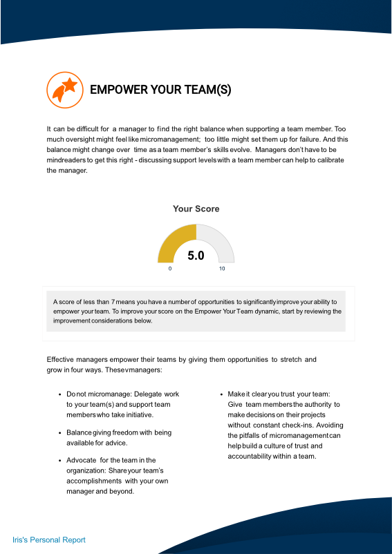 - Personaliza tu reporte de evaluación: Utiliza el nombre del encuestado en todo el reporte. Puede hacerlo en el encabezado, en el pie de página, en los bloques de texto o en los títulos de los gráficos. Incluye comentarios personalizados por cada aspecto que estés tratando.