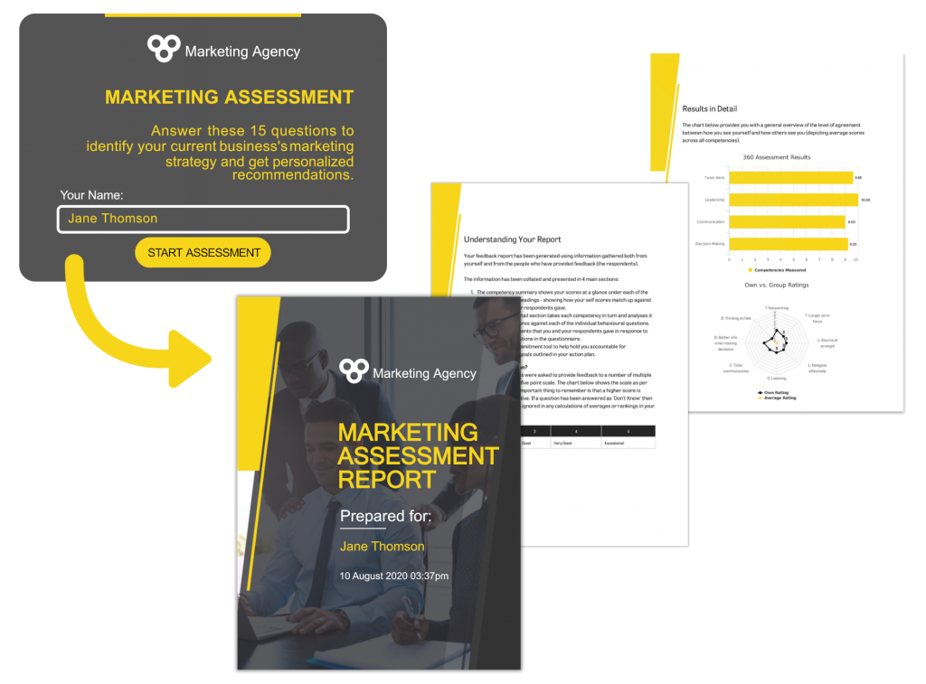 Un reporte de evaluación ofrece a los encuestados una visión clara de su perfil, empresa o situación y les proporciona recomendaciones pertinentes. ¿Y sabe cuál es la buena noticia? La creación de un reporte de evaluación puede automatizarse.