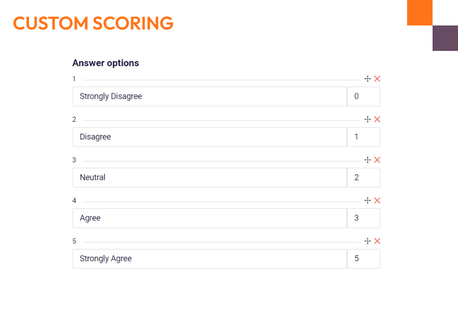 - Custom scoring: Assign a score to each answer option. You can then calculate and give respondents an overall score or a score per domain at the end of the questionnaire.