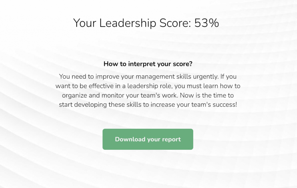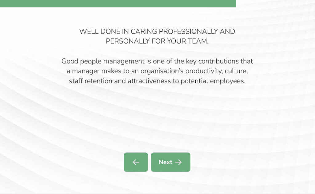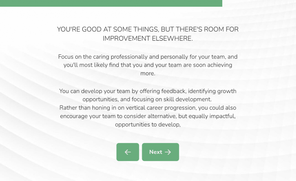 Just below is an example of a personalized PDF report based on a management self-assessment (If you want to find out how to generate reports like these yourself, check out more information about Pointerpro’s Report Builder):